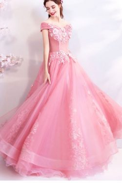 ชุดราตรียาวออกงานกลางคืน ปาดไหล่ สไตล์เจ้าหญิง สีชมพู