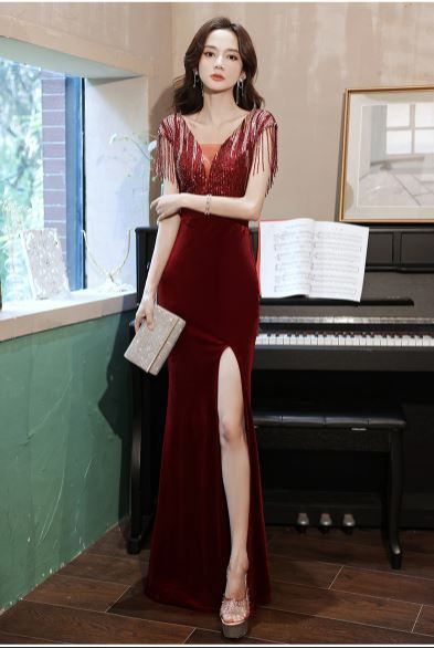 ชุดราตรียาว สีไวน์แดง ออกงานหรูหรา